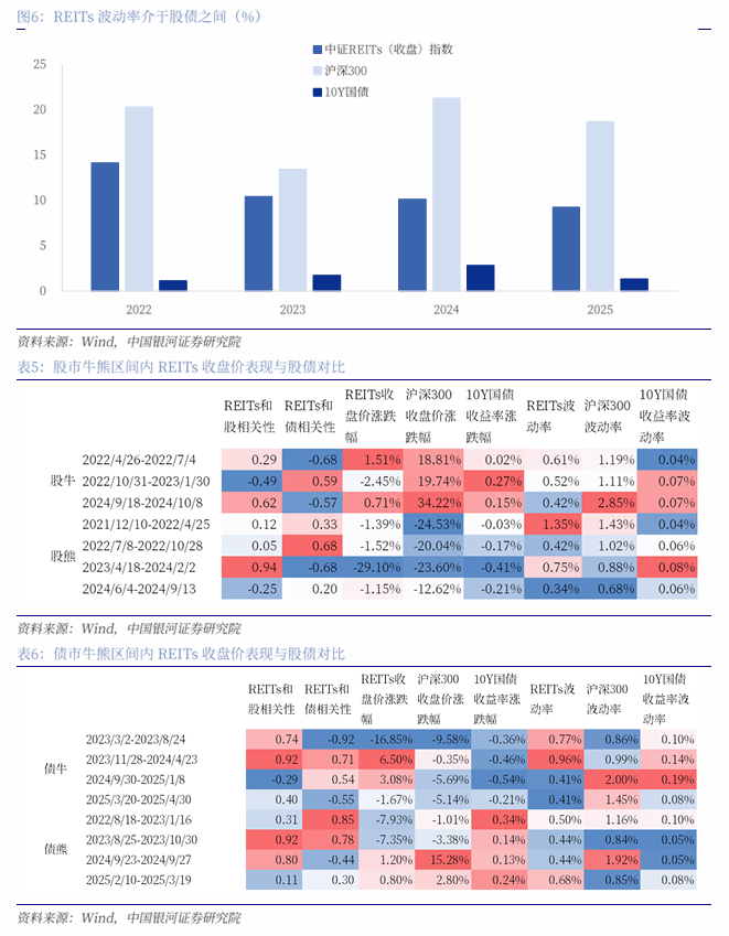 更进一步地,从股债牛熊的区间来看:首先,在牛市区间(2022/4-2022/7、2022/10-2023/1、2024/9-2024/10),REITs指数/沪深300/十债收益率的平均波动率分别为0.52%/1.72%/0.06%,股市收益波动幅度远大于其他资产;而在股市熊市区间(2021/12-2022/4、2022/7-2022/10、2023/4-2024/2、2024/6-2024/9),REITs指数/沪深300/十债收益率的平均波动率为0.72%/1.00%/0.06%,REITs波动率和沪深300较为接近,且均远高于十债,综合来看,股熊区间REITs波动率的股性更为明显。其次,债市走牛(2023/3-2023/8、2023/11-2024/4、2024/9-2025/1、2025/3-2025/4)的时期中,REITs指数/沪深300/十债收益率的平均波动率为0.63%/1.32%/0.13%,而在十债走熊(2022/8-2023/1、2023/8-2023/10、2024/9、2025/2-2025/3)的区间内,REITs指数/沪深300/十债收益率的平均波动率为0.51%/1.20%/0.07%,综合来看,无论债牛还是债熊阶段,REITs收益不确定性均较为明确地介于股债之间。