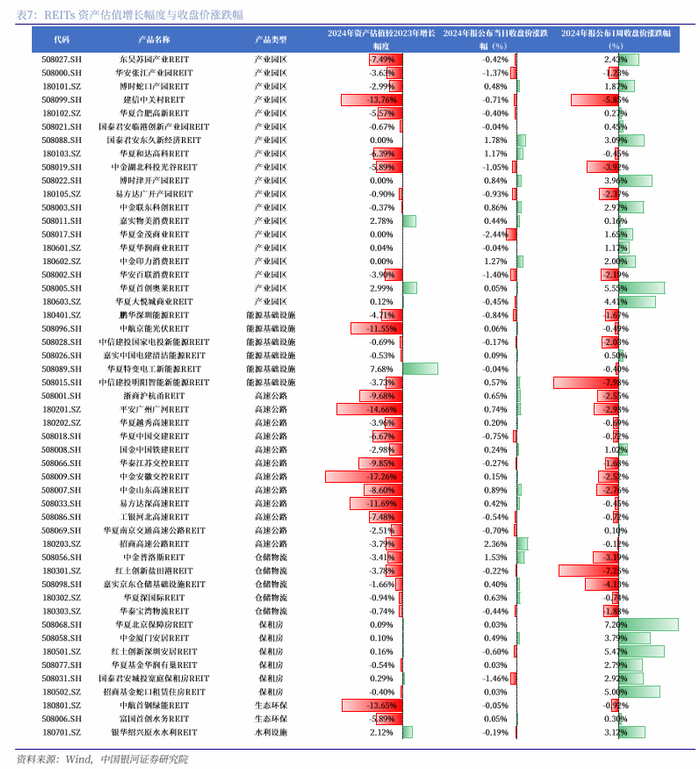 从年报披露后的市场表现来看,REITs二级市场价格具有明显的价值驱动特征,即资产评估价值越高、价格涨幅越大,进一步验证其权益属性。鉴于市场投资者需要一定时间消化年报所披露的信息,因此我们主要观察年报披露1周内REITs二级市场表现对底层资产估值变动的反应,复盘结果显示,基本面良好——即2024年资产评估价值(第三方评估机构给出的基础设施项目的年末市场价值)相较2023年出现正向增长的产品,年报披露1周内价格往往上涨,平均涨幅超过3%,其中1周内收涨的产品达90%;反之,估值下降的REITs收盘价多数下跌,平均跌幅约1%,仅有30%的产品在1周内收涨,这表明二级市场对REITs定价存在基本面锚定效应,产品价值越高、价格涨幅越大。因此,不同行业所属的不同基本面变化对底层资产影响较大,这与权益市场的逻辑相似,行业基本面与产品底层项目数据为投资者提供更重要的决策参考。