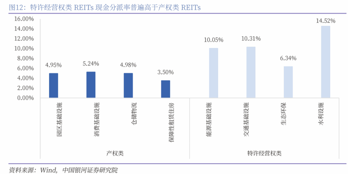 现金分派率在普适性上存在明显局限,更适用于在经营权类产品内部横向对比:现金流分派率只反映当年现金流情况,可能受到宏观环境和底层资产特殊情况影响,年度间波动水平较大;特许经营权类REITs到期底层资产价值归零,收益期间每年现金分派包括分红和本金摊还,特许经营权REITs2024年现金流分派率位于6%-15%区间,显著高于产权类REITs3%-6%水平,不同属性REITs间,现金分派率不具有横向可比性。
