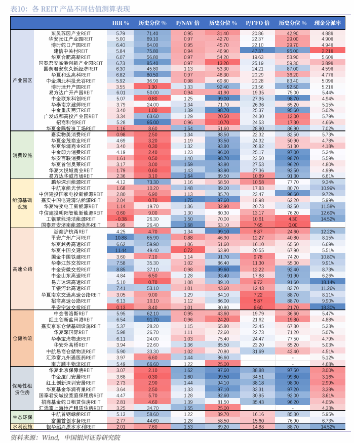 1)IRR和P/NAV表现结论基本一致。对于IRR来讲,作为收益率指标,内部收益率越高,意味着估值水平越便宜;而对于P/NAV来讲,价格倍数越高则反映当前估值越低。因此从IRR和P/NAV表现热力图能够看出,更高的IRR基本对应着更低的P/NAV,二者的相互印证也说明了IRR和P/NAV是两种对整体REITs品类均较为使用,有助于各品类REITs产品在统一度量下横向比较的估值方法。