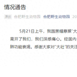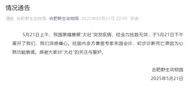 5月21日晚,合肥野生动物园通报:5月21日上午,我园黑帽悬猴“大壮”突发疾病,经全力抢救无效,于5月21日下午离开了我们,我们深感痛心。经国内多方兽医专家来园会诊,初步诊断死亡原因为心肺功能衰竭。感谢大家对“大壮”的关注与爱护。