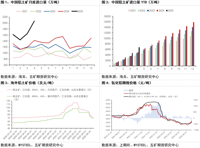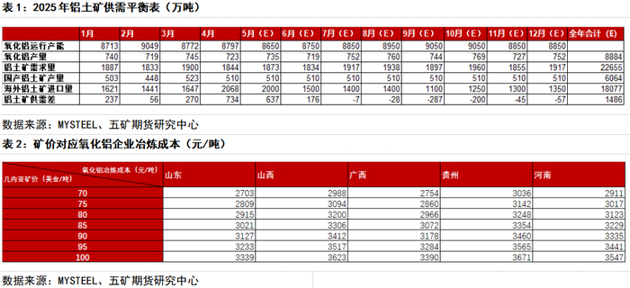 最新海关数据显示,2025年4月铝土矿进口2068万吨,同比增加45.36%,环比增加25.59%;2025年前四个月合计进677万吨,较去年同期增加1730万吨,同比增加34.27%。主要原因是几内亚矿石新建项目持续放量叠加非主流国家增加矿石出口。由于当前全球铝土矿海漂库存仍维持高位,预计5月进口量仍将维持高位。根据船期和几内亚发运季节性推测平衡表,在AXIS矿区持续停运和事态没有进一步升级的条件下,预计7月矿石供应将初步转紧,9月和10月预计因雨季到港减少导致铝土矿大幅去库。但今年前五个月矿石供应大幅过剩,多数氧化铝厂矿石库存较为充裕,氧化铝企业生产预计不会受到明显影响。但几内亚“限采事件”将提高矿石卖方议价能力,据阿拉丁(ALD)推演和判断,进口矿石稳定在70-85美元可能性提高,根据测算,对应晋豫地区完全成本区间为3000-3300元/吨,对应主产区山东地区完成成本区间为2700-3000元/吨。