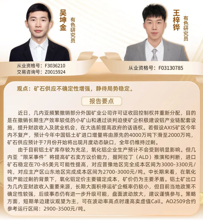 尽管氧化铝近期密集检修导致供应阶段性偏紧,主因是当前氧化铝厂仍使用前期到港的高价矿,多数企业因亏损提前检修。但随着近期成交的低价矿到港叠加氧化铝现货价格触底回升,多数氧化铝厂将扭亏为盈,预计前期减产产能将逐步复产。中长期来看,在氧化铝产能过剩的背景下,氧化铝定价主要锚定成本,矿价仍为主要矛盾。铝土矿出口为几内亚财政收入重要来源,长期大面积停运矿企概率仍较小,但目前当地政策不确定性较强,后续事态仍有进一步升级可能,盘面波动放大,建议谨慎参与。策略方面,短期单边建议观望为主,可在波动率高点时逢高卖虚值Call。AO2509合约参考运行区间:2900-3500元/吨。