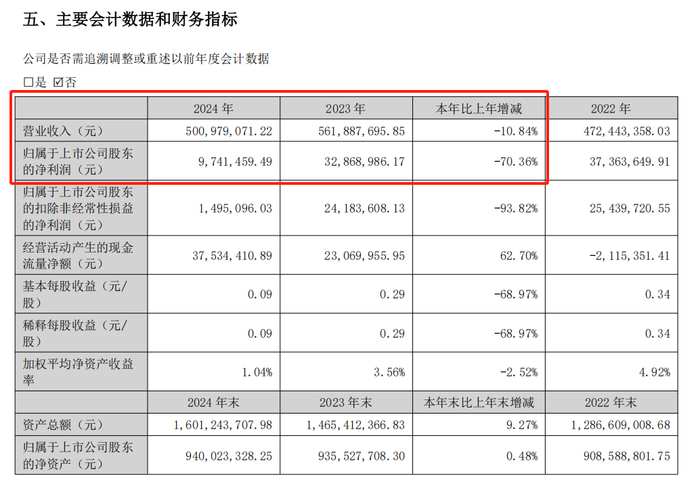 财务数据显示,2024年,公司实现营收5.01亿元,同比下降10.84%;归母净利润974.15万元,同比下降70.36%;扣非净利润仅为149.51万元,同比下降93.82%。今年一季度,公司营收1.37亿元,同比增长241.85%;归母净利润亏损195.44万元。