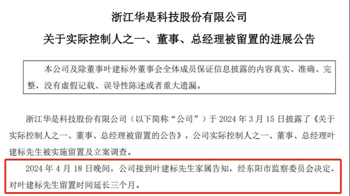 2024年4月18日晚,公司接到叶建标家属告知,经东阳市监察委员会决定,对叶建标留置时间延长三个月。