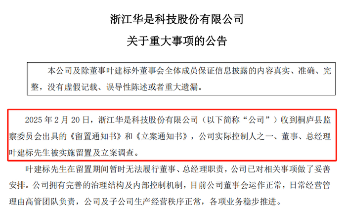 然而,就在公司续聘叶建标为总经理9天后,2月20日晚,华是科技公告,公司收到桐庐县监察委员会出具的《留置通知书》和《立案通知书》,叶建标再次被实施留置及立案调查。对于叶建标在留置期间暂时无法履行董事、总经理职责,公司已对相关事项做了妥善安排。