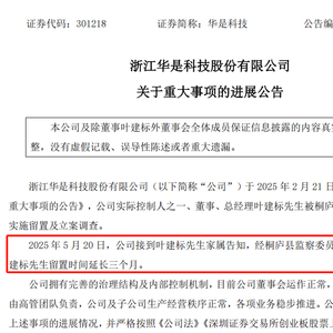 对于此次被延长留置,华是科技表示,目前公司董事会运作正常,日常经营管理由高管团队负责,公司及子公司生产经营秩序正常,公司将持续关注上述事项的进展情况。