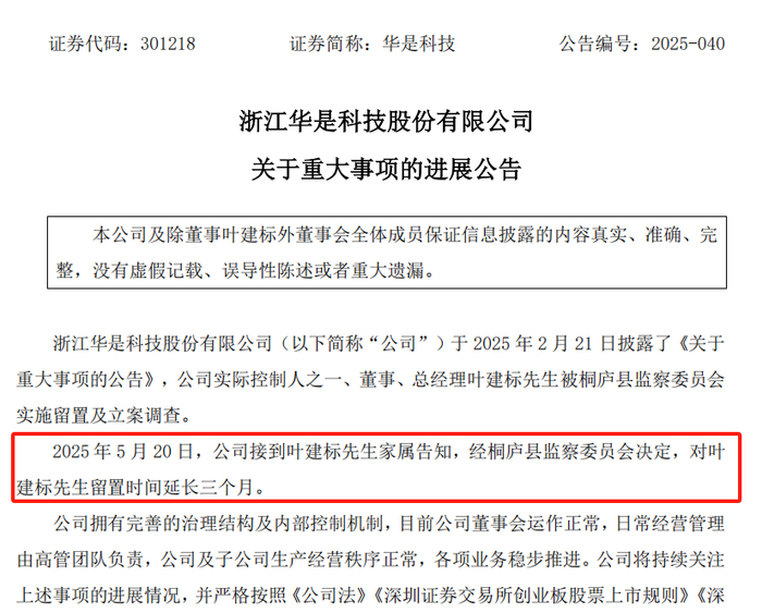 5月21日晚,华是科技发布公告,5月20日,公司接到叶建标家属告知,经桐庐县监察委员会决定,对公司实际控制人之一、董事、总经理叶建标留置时间延长三个月。值得注意的是,这是叶建标第二次被延长留置。