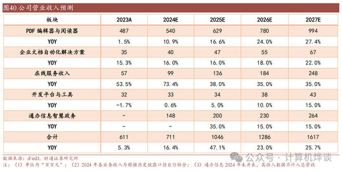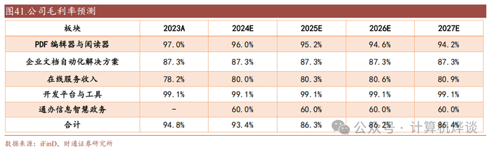 毛利率预测:2025-2027年,(1)预计PDF编辑器与阅读器毛利率为95.2%、94.6%、94.2%,呈现稳中略降状态,主要由于渠道占比持续提升,渠道返点导致产品毛利率略有下降,预计收入增速保持稳定后,毛利率也将企稳;(2)预计企业文档自动化解决方案毛利率稳定为87.3%,垂直行业渗透需要一定过程,渗透率较高后毛利率有望提升;(3)预计在线服务收入为80.3%、80.6%、80.9%,呈现略增长状态;(4)预计开发平台与工具稳定为99.1%,SDK业务已经成熟,因此维持高毛利率;(5)预计通办信息智慧政务毛利率稳定为60.0%,根据其2024年扣非净利率24%,估计其业务毛利率应高于55%。