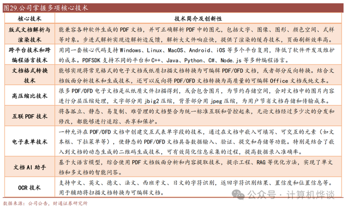 全球仅有少数公司自主研发掌握PDF格式生成、渲染、转换与版面识别等关键技术,实现B端场景商业化的公司尤为稀缺。好的PDF编辑器需要多年对各类文档格式、各种工程场景经验进行积淀,才能实现To B的通用性;PDF厂商还应能提供一系列服务,包括跨平台兼容性、安全加密、文档协作、电子签名、云计算能力等,具有良好的扩展性和灵活性,以便满足行业产品灵活定制。PDF编辑器技术门槛包括以下几点: