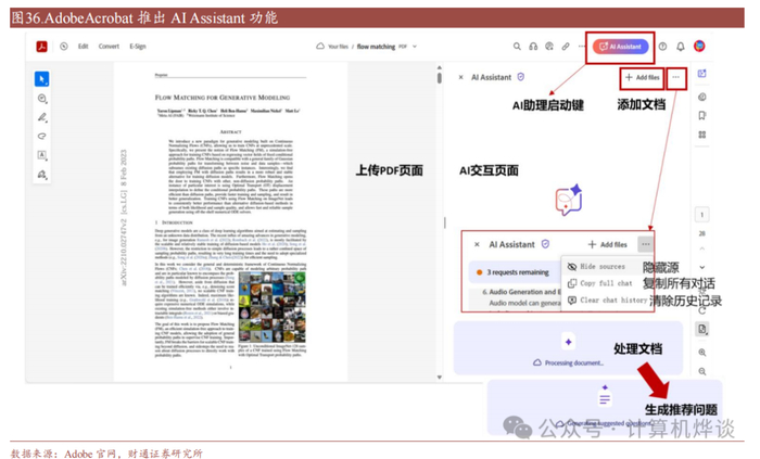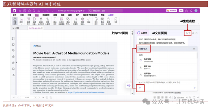 PDF 厂商通过外接大模型,AI 赋能高效办公。国际主流 PDF 厂商一般通过外接成熟大模型 API 实现 C 端的 AI 交互,包括总结、翻译、改写等通用功能。Adobe通过外接 GPT-4o 推出了 AIAssistant,并将其深度集成到 Acrobat 工作流程中,旨在提高文档生产力。AIAssistant 可在桌面、Web 和移动设备上使用,包括AdobeAcrobatReader、AdobeAcrobat 桌面版(IFinDows 和 macOS)与 Acrobat 在线版等,可一次上传 10 份文档,实现同时处理 600 页长文本。随着上传文档容量扩大,未来有望建立个人文档资料库,实现便捷的资料查询与对话分析。