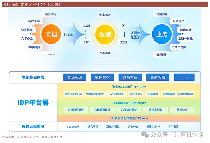 面向国内B端推出智能文档处理中台IDP,协助企业构建大模型时代的高质量知识库。2024年,公司布局国内垂类市场,智能文档解决方案(IDP)发布内测版本,已建立在政法、供应链、审计等行业的标杆试用客户。福昕IDP核心功能涵盖IDP DAC(PDF内容分析与转换)、IDP SDE(结构化数据提取)和IDP KBM(知识库管理),通过结合PDF文档解析、OCR、表格侦测、版面分析、机器深度学习(包括大语言模型)等技术,实现按需从常见格式文档中提取出所需数据。福昕IDP结合大语言模型和企业领域知识,将传统大数据项目向文档型非结构化数据处理延伸,通过文档解构、内容识别和数据应用共同作用,帮助企业“唤醒”大量沉睡的文档,让文档成为系统“对话”的媒介。