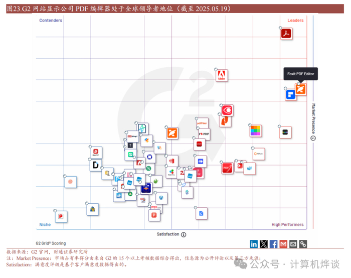 B端PDF业务需求刚性,竞争格局清晰。Adobe是PDF格式的发明者以及文档解决方案的全球龙头企业,自2009年起开启订阅转型之路,2024年Document Cloud收入达到31.8亿美元,同比增长18%,彰显出订阅模式强大的生命力。目前全球形成了以Adobe、Foxit(福昕)、Nitro、Tungsten、Wondershare(万兴科技)等为代表的PDF品牌,根据G2网站数据,综合客户满意度和市场占有率,公司在总分上仅次于Adobe排名第2,位列领导厂商名单。