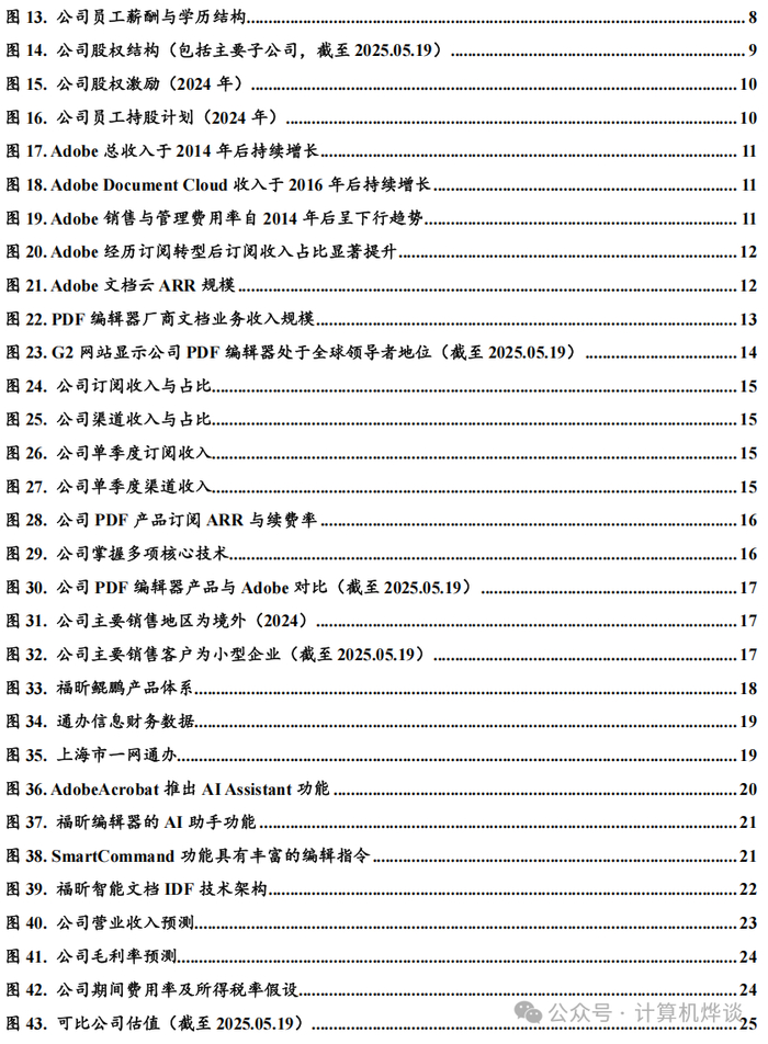 专注成就专业,转型更上一层。公司掌握完全自主产权的PDF核心技术,面向全球提供PDF电子文档解决方案,产品受到亚马逊、谷歌等科技巨头认可。2022年首次提出“订阅+渠道”双转型战略,2021-2024年订阅收入占比由15%提升至49%,渠道收入占比由24%提升至41%。公司通过收购福昕鲲鹏与通办信息,切入国内信创与智慧政务领域。1Q2025,若剔除收购影响,公司同口径收入增长16.22%,经营业绩实现盈亏平衡,转型成效显著。