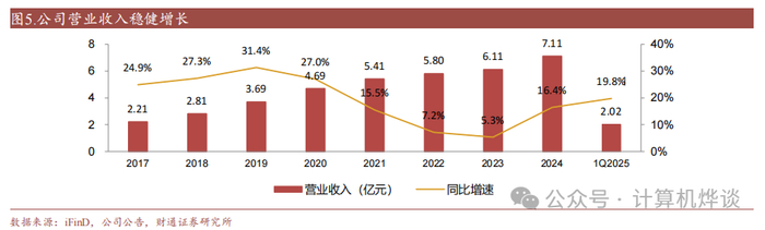 已度过转型阵痛期,订阅带动收入增速上行。2021 年起,公司全面施行“订阅+渠道”双转型战略,由于订阅价格仅约为授权价格的 50%,新拓展订阅客户确认的收入规模同比出现锐减,导致尽管公司订阅推行顺利但表观收入增速持续下行,至 2023 年收入增速降至 5.3%。此后,随着订阅收入占比持续提升,高增长的订阅收入驱动收入增速回升,2024 年、1Q2025 公司营收同比增长 16.4%、19.8%,呈现加速上行趋势。1Q2025,若剔除因收购新增收入,公司原有业务和去年同期同口径相比增长了 16.22%。