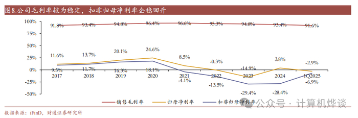 费用率达峰,已进入下行趋势。2021-2023 年,公司销售、研发费用率总体呈现提升趋势,此后至 1Q2025 费用呈现下行趋势,表明转型早期铺垫的直销渠道已逐步形成复利效应,在高续费率背景下持续渗透客户,销售费用率有望持续下行;随着订阅产品走向成熟,AI 研发投入稳健开展,我们预计研发费用率未来将回落至 15%-20%,管理费用率也将随着收入规模扩大而小幅回落。