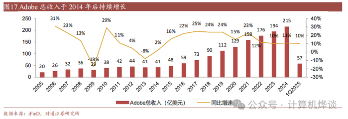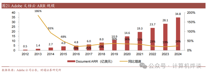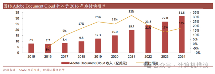 Adobe 是 PDF 格式的发明者以及文档解决方案的全球龙头企业,近年仍保持稳健增长态势。其三大核心业务为 Document Cloud(文档云)、Creative Cloud(创意云)和 Experience Cloud(体验云)。自 2009 年起,Adobe 开启订阅转型之路,2013 年正式全面由授权转订阅,随后收入增速持续上行,最高达到 25%的收入同比增速。2024 年,公司收入规模达到 215 亿美元,同比增长 11%;Document Cloud收入达到 31.8 亿美元,同比增长 18%,彰显出订阅模式强大的生命力。1Q2025,Adobe 将业务分拆重组,原 Document Cloud/Creative Cloud/Experience Cloud,重组为 Business Professionals & Consumers 与 Creative & Marketing Professionals。其中 Business Professionals & Consumers(商务专业人士和消费者)可代表 Adobe文档类业务,其订阅收入为 15.3 亿美元,同比增长 15%,仍呈现稳健增长态势。