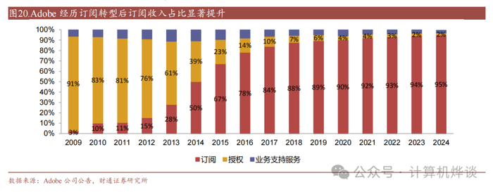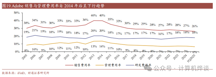 费用率“先升后降”,是授权转订阅的必经之路。2012-2014 年,Adobe 销售、研发、管理费用率呈现上升趋势,至 2014 年达到 40%、20%、14%的峰值。2015 年后,销售与管理费用率基本呈现持续下行趋势,研发费用率稳定在 17%左右,体现出随着订阅模式推进,客户对转型的接受度提升,销售复利效应带动费用率下行,而科技企业为保持技术领先性,在 AI 大模型时代研发投入仍需与业务规模同步扩张。