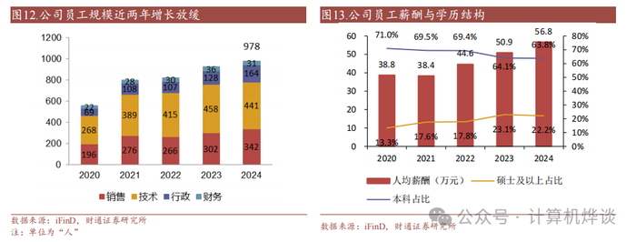 员工规模得到控制,人均创收企稳回升。2024 年,公司全球员工数量 978 人,较去年末新增 54 人,主要由于收购福昕鲲鹏并表影响,原有业务板块的员工数量基本保持稳定。2024 年研发人员减少 17 人,销售人员增加 40 人,表明公司产品已走向成熟,进入放量推广阶段。2023-2024 年公司人均创收分别为 66.1、72.7 万元,呈现企稳回升状态,随着销售复利效应发挥,我们预计人均创收将持续上行。