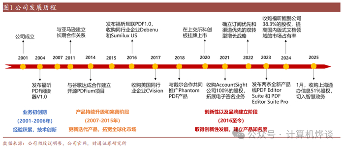掌握完全自主产权的PDF核心技术,面向全球提供PDF电子文档解决案。公司成立于2001年,专注PDF底层技术研发,2004年推出自主知识产权的福昕PDF阅读器V1.0,此后与全球众多科技巨头持续建立合作关系。公司2011年与亚马逊达成战略合作,将其PDF显示与渲染技术应用于Kindle设备;2014年与谷歌共建开源项目PDFium,技术嵌入Chrome浏览器、安卓系统等;2016年后进入品牌深化阶段,不断收购同行企业扩张产品线;2018年与戴尔合作全球推广Phantom PDF编辑器。2022年首次提出“订阅+渠道”双转型战略,2021-2024年订阅收入占比由15%提升49%,渠道收入占比由24%提升至41%,转型成效显著。
