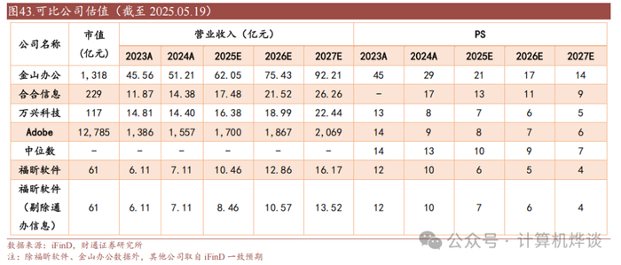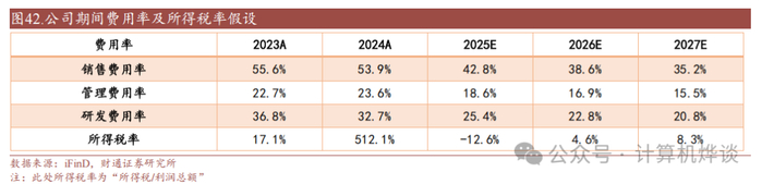 费用率与所得税率预测:随着订阅收入占比提升,订阅续费率维持 90%以上,前期开展的产品研发以及销售拓展形成的产品经验、行业 know-how、客户资源将形成复利效应,订阅拓展边际成本降低,因此我们预计销售、管理、研发费用率将呈现长期下降态势。其中 2025 年出现费用率大幅下降,主要系并表导致通办信息收入与费用一同入表,预计后续费用率将稳定下行,直到稳定于行业龙头 Adobe的费用率水平。所得税方面,2024 年公司发生的研究开发费用可按 100%加计抵扣当年应纳税所得额,我们预计税收优惠政策将会持续,随着公司利润总额扭亏并稳步增长,公司所得税额也将逐步转正。