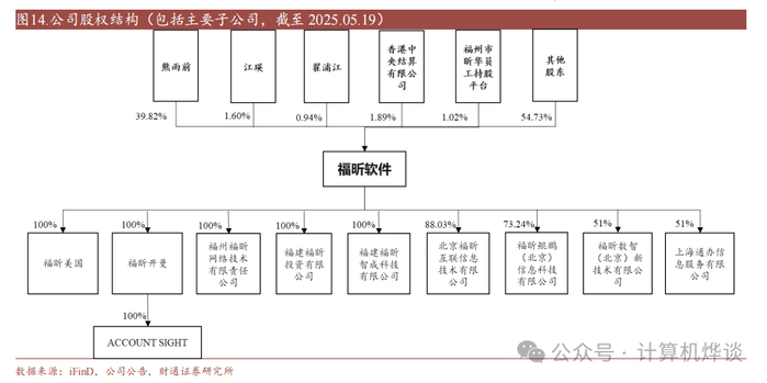 创始人控股,通过收购扩张版图。公司创始人与实际控制人熊雨前,15 岁考入中国科技大学少年班学习计算机专业,后在美国硅谷创业四年,2001 年在福州软件园创办福昕软件,现持股比例为 39.82%。控股子公司布局方面,公司境外运营主体主要为福昕美国,覆盖技术开发、产品分销与区域管理,2024 年实现营业收入6.25 亿元;2024 年取得福昕鲲鹏控股权,强化国内 OFD 版式文档市场地位;旗下福昕网络、福昕智成、福昕投资等境内主体承担技术研发、销售网络搭建及产业投资职能;2025 年 1 月收购并增资上海通办信息,持股 51%。