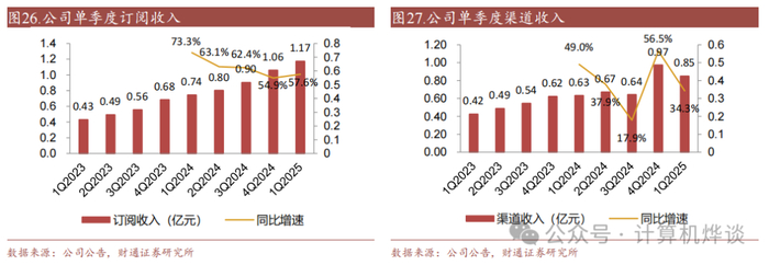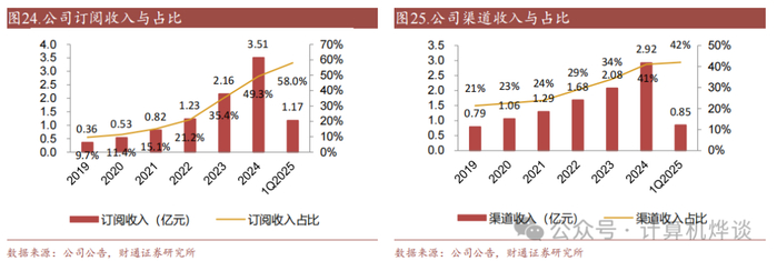 2019-2024 年,公司订阅收入由 0.36 亿元提升至 3.51 亿元,CAGR 为 57.9%,订阅收入占比由 9.7%提升至 49.3%;公司渠道收入由 0.79 亿元提升至 2.92 亿元,CAGR 为 29.9%,渠道收入占比由 21%提升至 41%。至 1Q2025,公司订阅与渠道收入占比达 58%、42%再创新高,表明当前仍处于快速转型阶段。
