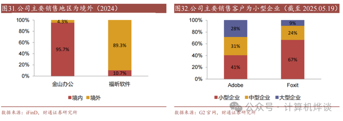标准化产品面向海外中小企业客户,通过差异化客群加速市占率提升。2024 年,以流式文档业务为主的金山办公境外业务占比仅为 4.3%,而公司以版式文档业务为主,境外占比 89.3%;客户群体方面,对比 Adobe 的 31%、41%的中、小型企业占比,公司中、小型企业占比为 24%、67%。因此从收入结构来看,公司没有直接的竞争对手,目前仍处于市占率提升的起步阶段。我们认为,如后续北美经济环境承压,公司通过高性价比产品有望进一步渗透中型企业客户,持续抢占Adobe 市场份额。