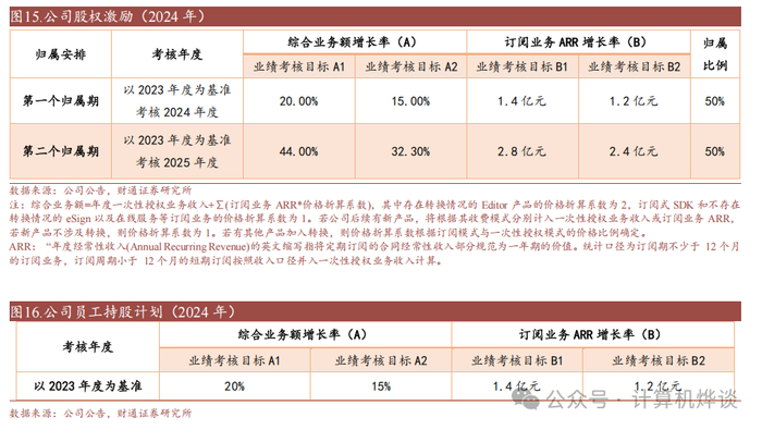 发布股权激励和员工持股计划,员工激励充分。2024 年 8 月,公司发布《2024 年限制性股票激励计划(草案)》,以 2023 年综合业务额或订阅 ARR 为考核基准,针对 2024-2025 年业务增长设定双重目标,彰显了公司管理层对于业务规模快速增长的信心。根据草案,2024 年综合业务额增长率目标分为 15%、20%,2025 年较 2023 年增长率目标则提升至 32.3%、44%;订阅业务 ARR 增长额同样分层设计,2024 年目标分别为 1.2 亿元、1.4 亿元,2025 年订阅业务 ARR 较 2023 年增长额目标为 2.4 亿元、2.8 亿元。公司 2024 年底 ARR 已实现 4.11 亿元,同比增幅为 1.61 亿元,超额达成 B1 类目标,我们预计 2025 年 ARR 增幅将基本维持 2024年的幅度。