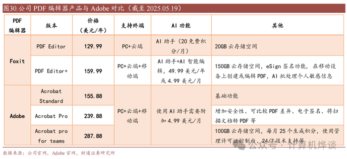 产品功能基本全面覆盖,性价比优势加速替代 Adobe。公司 PDF Editor 与 PDF Editor+价格分别为 Acrobat Standard 与 Acrobat Pro 的 83.4%、66.7%,在功能相似的背景下具备显著性价比优势;AI 助手增量功能方面,公司与 Adobe 月订阅定价相同,同时公司具备 Adobe 没有的“Smart Command”编辑功能,AI 方面进展已经反超了龙头 Adobe。