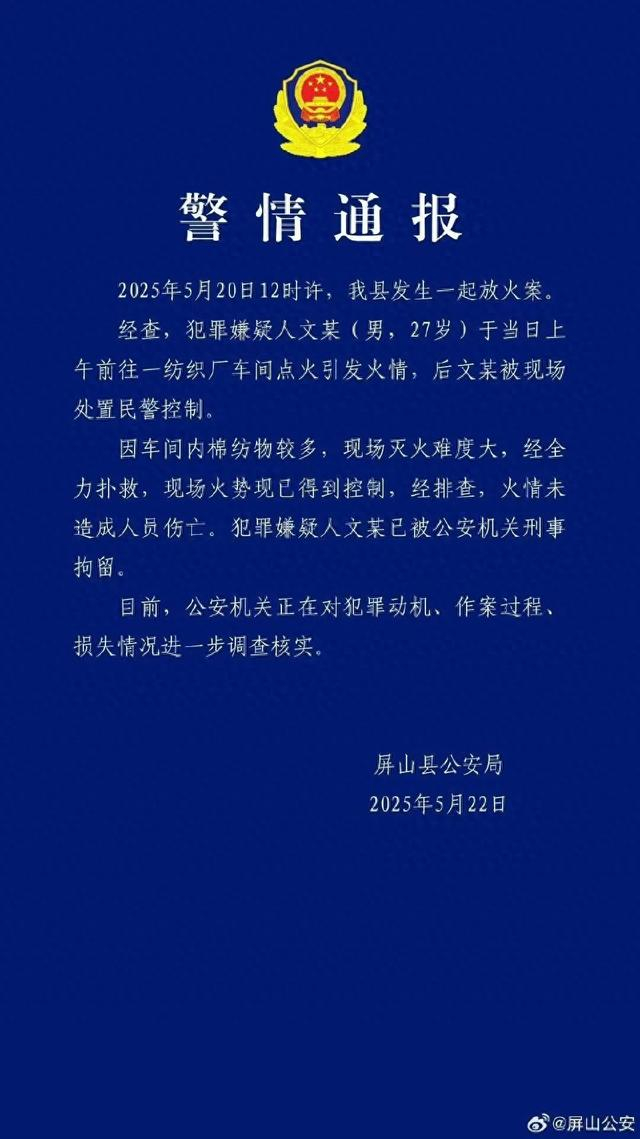 5月20日12时许,屏山县发生一起放火案。经查,犯罪嫌疑人文某(男,27岁)于当日上午前往一纺织厂车间点火引发火情,后文某被现场处置民警控制。