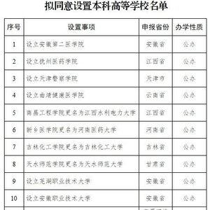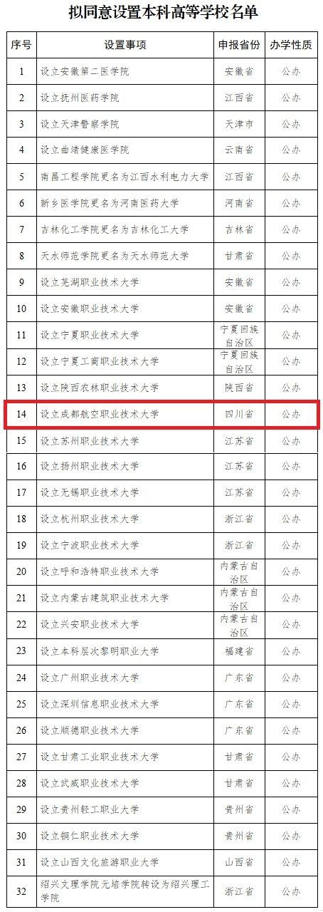 根据《中华人民共和国高等教育法》《普通高等学校设置暂行条例》《普通本科学校设置暂行规定》《本科层次职业学校设置标准(试行)》等有关规定以及第八届全国高等学校设置评议委员会考察评议结果,经教育部党组会议审议,拟同意设置安徽第二医学院等32所学校。其中,成都航空职业技术学院拟升级为成都航空职业技术大学。