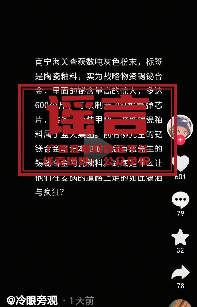 网传南宁海关查获“25吨锑锭”“30吨灰色陶瓷釉料粉末”为不实信息