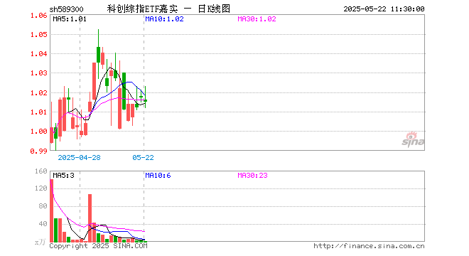 5月22日,截止午间收盘,科创综指ETF嘉实(589300)跌0.20%,报1.015元,成交额89.47万元。科创综指ETF嘉实(589300)重仓股方面,海光信息截止午盘跌0.09%,寒武纪跌0.40%,中芯国际涨0.05%,金山办公涨0.20%,中微公司跌0.11%,联影医疗跌1.39%,传音控股涨0.54%,百利天恒跌0.02%,澜起科技涨2.20%,华润微涨0.13%。