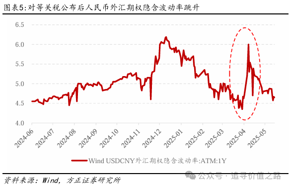 究其原因,本轮异动主要还是受美国4月2日发布的"对等关税2.0"政策影响。美国单边大幅增加对中国关税,显著超出市场预期区间。4月4日,针对美国政府4月2日宣布对中国输美商品征收“对等关税”,国务院关税税则委员会发布公告,对原产于美国的所有进口商品加征34%关税。政策宣布后,USDCNY外汇期权隐含波动率跳升,也侧面反映风险溢价重估。