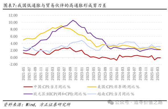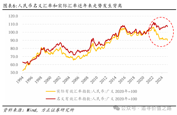 实际有效汇率与名义汇率走势的背离更多受通胀差影响。此次实际汇率的深度调整(1994年汇率并轨以来最大降幅)主要源于国内外价格水平的分化:若只看名义汇率,人民币对贸易伙伴货币的加权汇率仅贬值约5%,更多则是通胀差主导超调,2022-2025年间,我国低通胀与贸易伙伴的高通胀形成剪刀差,通过实际汇率公式(REER=NEER×P*/P)放大调整幅度。