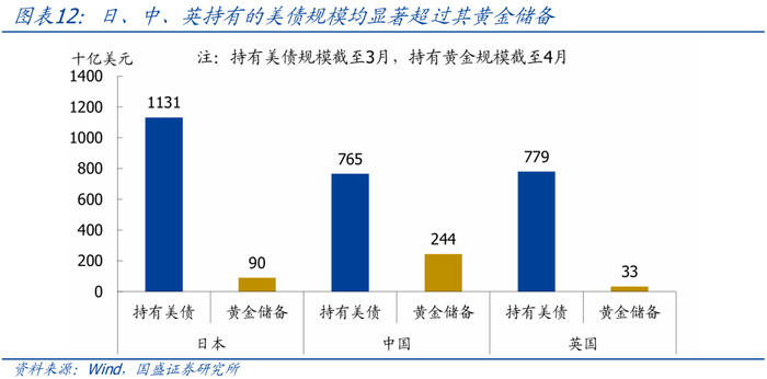 3、美债作为重要的外汇储备资产,可选的替代品十分有限。主要国家持有的美债数量普遍是其黄金储备的数倍乃至数十倍,即便抛售美债换取黄金也需要较长时间,这决定了海外国家减持美债的速度不会很快;