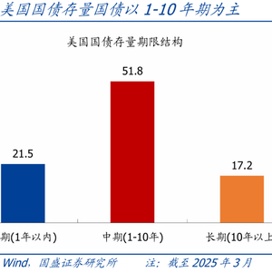 >期限结构:美国国债期限可大致划分为短期(1年以内,也称T-Bills)、中期(1-10年,也称T-Notes)、长期(10年以上,也称T-Bonds)。存量角度看,截至2025年3月,短期国债占比21.5%,中期国债占比51.8%,长期国债占比17.2%,此外还包括TIPS债券和浮动利率票据,规模较小。增量角度看,2023年以来,美债发行中短期国债占比基本保持80%以上。通常而言,美国政府为降低负债成本,往往会在低利率时发行更多中长期国债,而在高利率时发行更多短期国债。