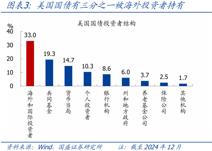 >投资者结构:截至2024年12月,美债第一大投资主体是海外投资者,包括海外市场机构和海外央行,占比高达33.0%;其次分别是共同基金19.3%、美联储14.7%、个人投资者10.3%、银行8.6%等。美债海外投资者中,海外央行占比约43%,海外私营部门占比约57%;海外投资者国别分布方面,截至3月,日本占比最高达12.5%,其次是英国8.6%、中国大陆8.5%、加勒比国家7.5%,其余国家和地区占比均在5%以下。