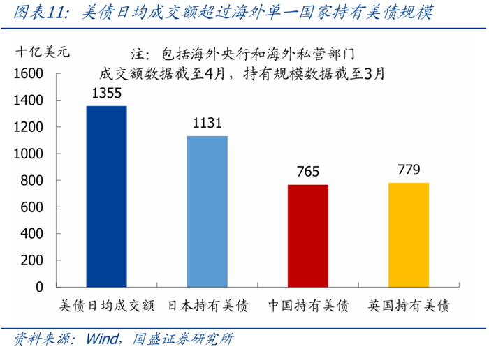 (2)美债市场规模极其庞大、且交易十分活跃,单一海外国家持有的美债数量相对有限,难以持续操纵美债走势;
