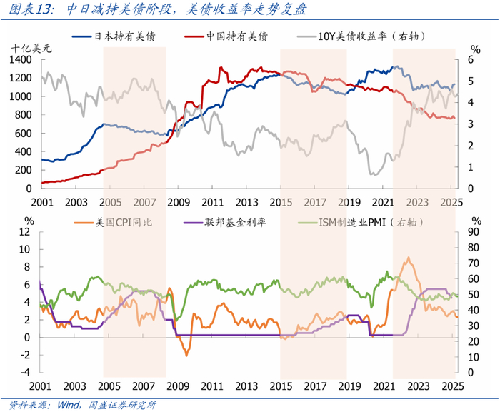 >减持复盘:中国自2015年“811汇改”后开始持续减持美债,2018年中美贸易摩擦升级后减持节奏并未明显加快。经过多年减持,中国持有的美债规模已从最高1.3万亿美元降至2025年3月的不到8000亿美元。日本自2000年以来共有3轮减持美债,第一轮是2005-2008年,第二轮是2015-2018年,第三轮是2022年至今,但长期看日本持有的美债规模仍呈现上升趋势。复盘中日减持时期的美债表现可以看出,美债收益率的走势基本和美国经济、通胀、货币政策高度一致,并未出现因中日减持而脱离基本面大幅上行的情况。