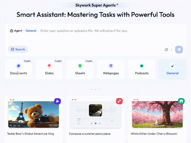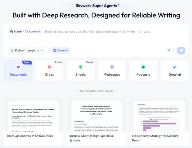 天工(Skywork)在这三个智能体里,集成了媲美OpenAI Deep Research的deep research能力,能够提供专家级、咨询级、科研级的内容生成结果。而网页、播客则是新媒体时代有趣也有意义的内容模态。5个专家级agents,都致力于针对办公、学习场景的真实用例,量身定制高质量内容。