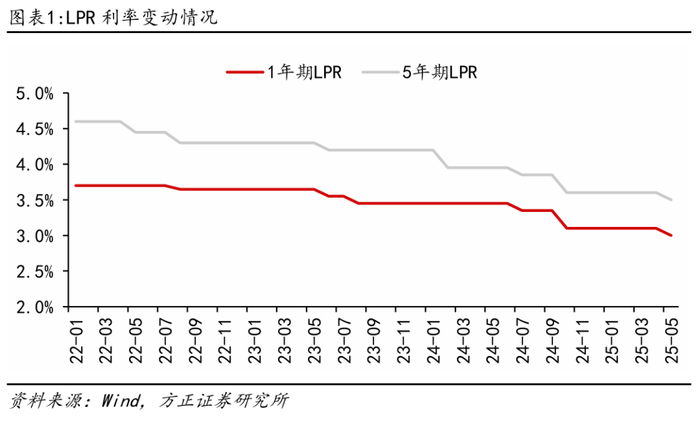 政策利率带动LPR利率同步下行,支持经济稳增长。2025年5月7日三部委发布“一揽子金融政策支持稳市场稳预期”,人民银行共宣布三大类共十项措施,其中包括“降低存款准备金率0.5个百分点”和“下调政策利率0.1个百分点”,符合央行此前多次提到的“根据国内外经济金融形势和金融市场运行情况,择机降准降息”的指引,稳增长信号强烈,5月20日,LPR利率正式同步下行0.1个百分点。银行方面,LPR利率调降有助于推动社会融资成本下降、支撑信贷需求改善,但也将拖累银行贷款收益率;静态测算本次LPR利率下行10bp将整体拖累上市银行息差6.18bp,由于贷款在年初进行重定价的比例更高,对2025年银行息差拖累约1.47bp,影响预计于2026年进一步显现。