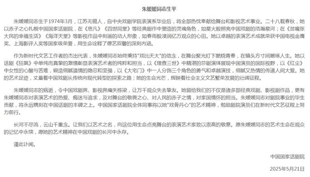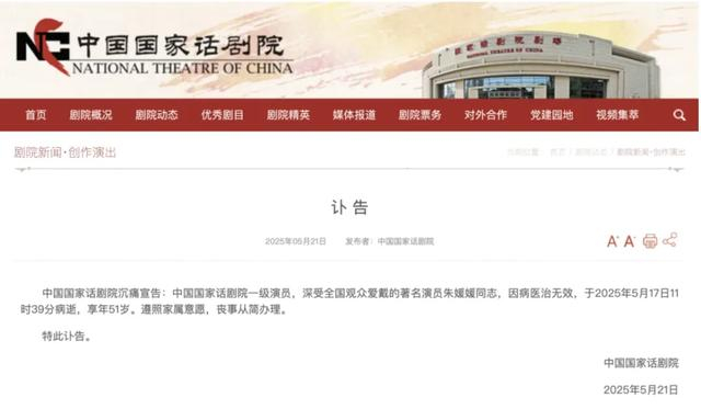 中国国家话剧院沉痛宣告:中国国家话剧院一级演员,深受全国观众爱戴的著名演员朱媛媛同志,因病医治无效,于2025年5月17日11时39分病逝,享年51岁。遵照家属意愿,丧事从简办理。