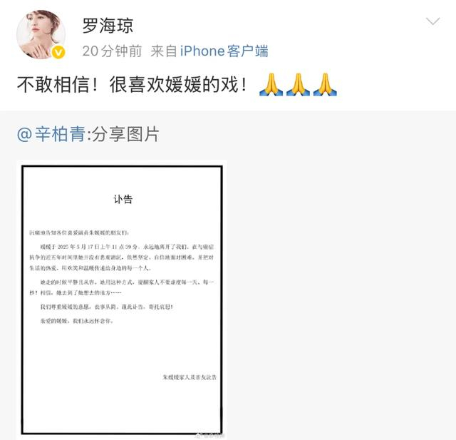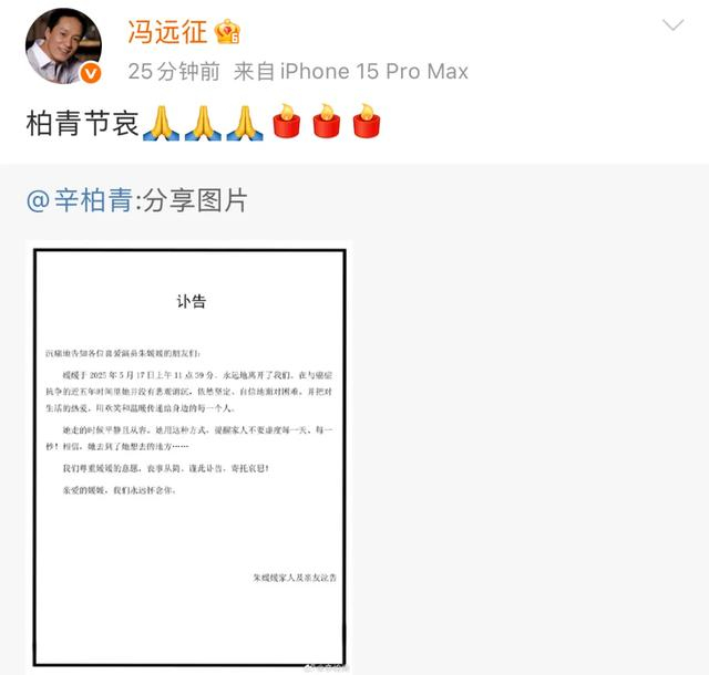 5月21日,辛柏青发布妻子朱媛媛讣告,透露因癌症去世。”辛柏青还透露会尊重朱媛媛的意愿,丧事从简。(此前报道)5月21日晚,倪萍发千字长文悼念朱媛媛: