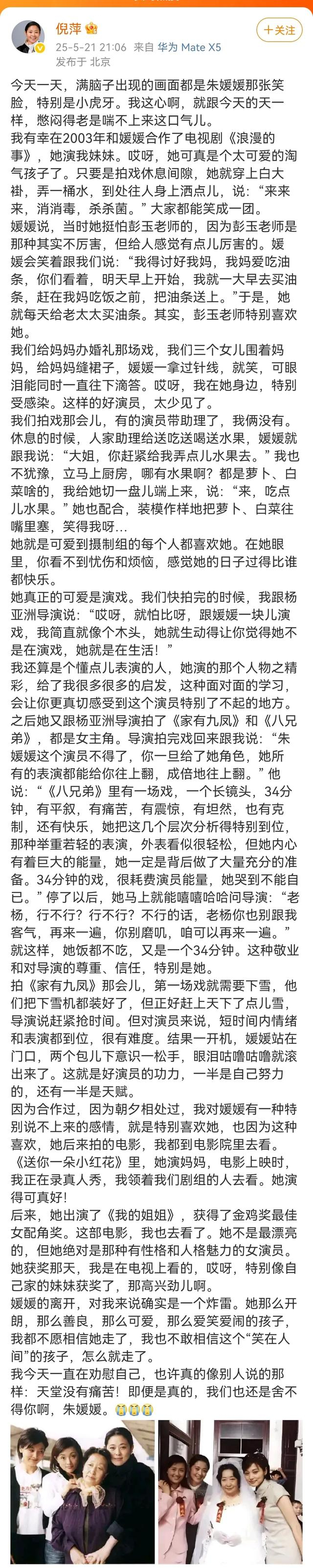 倪萍发千字长文悼念朱媛媛:满脑子都是她的笑脸……评论区直接看哭了