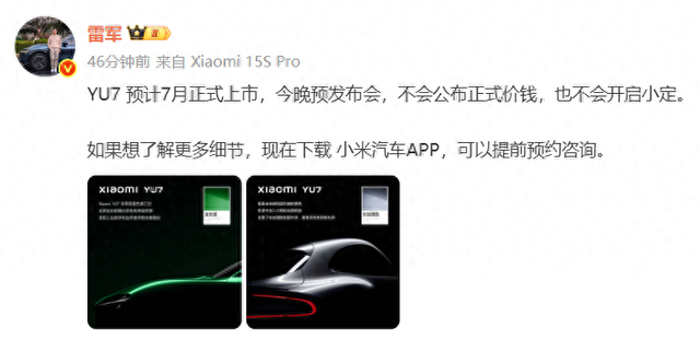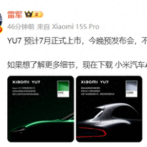 雷军:YU7预计7月正式上市,今晚不会公布正式价钱,也不会开启小定 澎湃新闻 澎湃新闻官方账号 2025.05.2213:11 关注 5月22日,小米创办人、董事长兼CEO雷军在微博发布消息称,YU7预计7月正式上市,今晚预发布会,不会公布正式价钱,也不会开启小定。