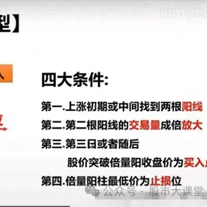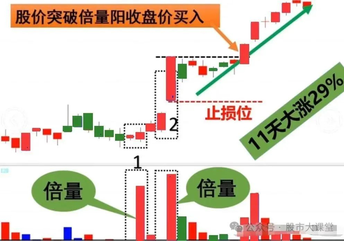 找到两根阳线第二根阳线对应的交易量成倍放大,然后第三天或者随后,股价突破倍量阳线收盘价为买入点,设置止损:倍量阳柱的最低价为止损位。