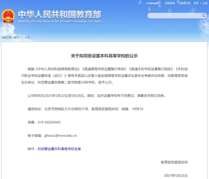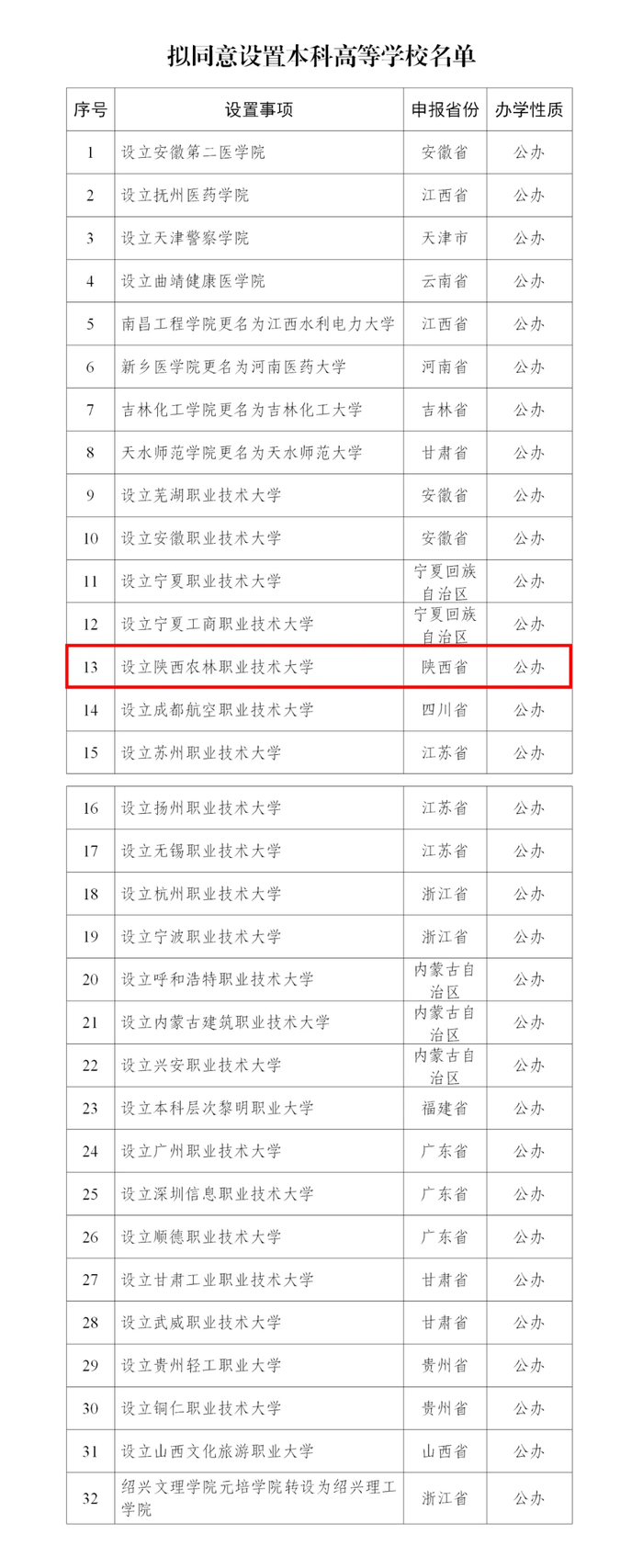 5月22日,教育部网站发布《关于拟同意设置本科高等学校的公示》,拟同意设置陕西农林职业技术大学等32所学校,这标志着陕西将再新增一所本科高校。