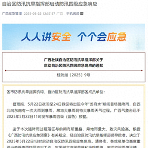 5月22日,自治区防汛抗旱指挥部下发通知,决定于2025年5月22日12时启动自治区防汛四级应急响应。